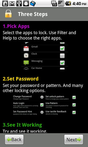App Protector can lock any application on your phone: SMS, Message, Gmail, Photo, Gallery, Market..any app u choose. You can choose to only lock sensitive apps, while leaving other apps unlocked. Never worry about a friend grabbing your phone again!